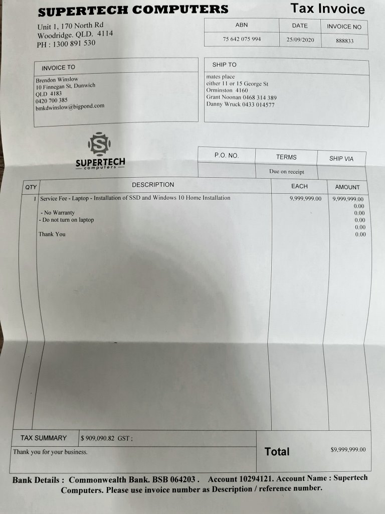 A mate of mine has a computer business called Supertech Computers and fixed my laptop, pretty much giving it new insides and although the attached invoice is a piss take he wouldn’t take any money. Anyone wanting new computers or even old ones fixed, please think about using Brett. He’s a good cunt, man and can be found at 0403326639 or